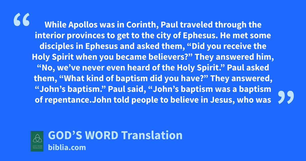 1 While Apollos was in Corinth, Paul traveled through the interior provinces to get to the city of Ephesus. He met some disciples in Ephesus 2 and asked them, “Did you receive the Holy Spirit when you became believers?”