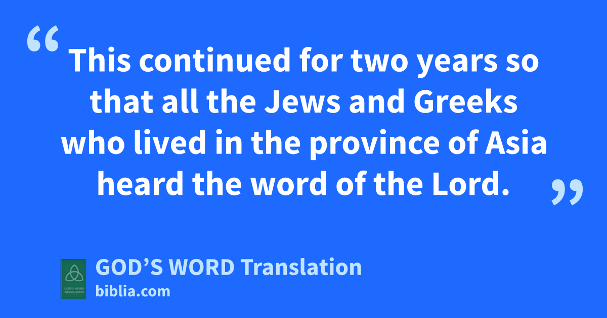 8 For three months Paul would go into the synagogue and speak boldly. He had discussions with people to convince them about God’s kingdom. 9 But when some people became stubborn, refused to believe, and had nothing good to say in front of the crowd about the way ⸤of Christ⸥, he left them. He took his disciples and held daily discussions in the lecture hall of Tyrannus. 10 This continued for two years so that all the Jews and Greeks who lived in the province of Asia heard the word of the Lord.