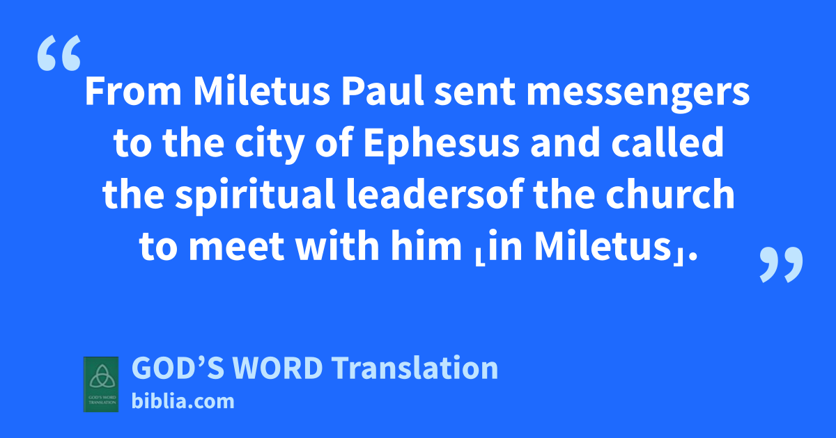 17 From Miletus Paul sent messengers to the city of Ephesus and called the spiritual leadersa of the church to meet with him ⸤in Miletus⸥. 18 When they were with him, he said to them, “You know how I spent all my time with you from the first day I arrived in the province of Asia. 19 I humbly served the Lord, often with tears in my eyes. I served the Lord during the difficult times I went through when the Jews plotted against me. 20 I didn’t avoid telling you anything that would help you, and I didn’t avoid teaching you publicly and from house to house. 21 I warned Jews and Greeks to change the way they think and act and to believe in our Lord Jesus.