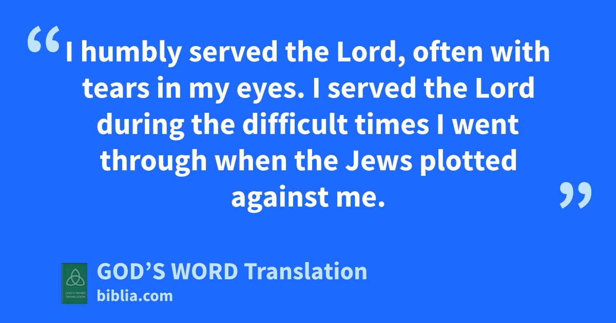 17 From Miletus Paul sent messengers to the city of Ephesus and called the spiritual leadersa of the church to meet with him ⸤in Miletus⸥. 18 When they were with him, he said to them, “You know how I spent all my time with you from the first day I arrived in the province of Asia. 19 I humbly served the Lord, often with tears in my eyes. I served the Lord during the difficult times I went through when the Jews plotted against me. 20 I didn’t avoid telling you anything that would help you, and I didn’t avoid teaching you publicly and from house to house. 21 I warned Jews and Greeks to change the way they think and act and to believe in our Lord Jesus.
