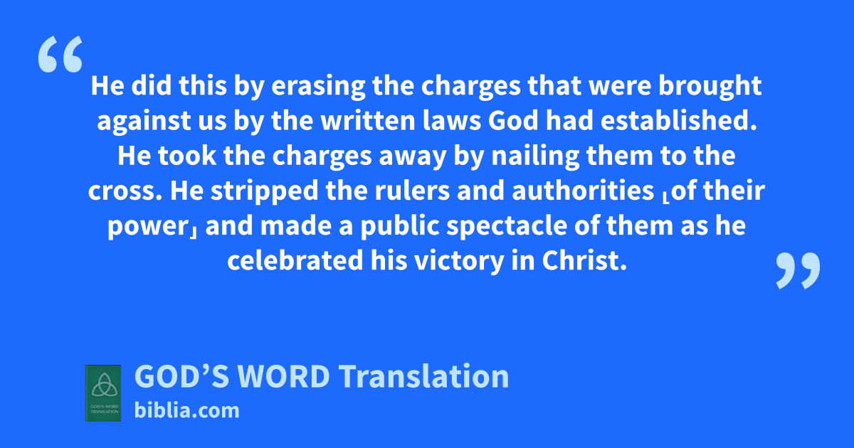 13 You were once dead because of your failures and your uncircumcised corrupt nature. But God made you alive with Christ when he forgave all our failures. 14 He did this by erasing the charges that were brought against us by the written laws God had established. He took the charges away by nailing them to the cross. 15 He stripped the rulers and authorities ⸤of their power⸥ and made a public spectacle of them as he celebrated his victory in Christ.