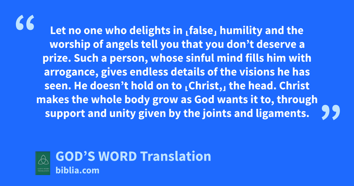 18 Let no one who delights in ⸤false⸥ humility and the worship of angels tell you that you don’t deserve a prize. Such a person, whose sinful mind fills him with arrogance, gives endless details of the visions he has seen. 19 He doesn’t hold on to ⸤Christ,⸥ the head. Christ makes the whole body grow as God wants it to, through support and unity given by the joints and ligaments.