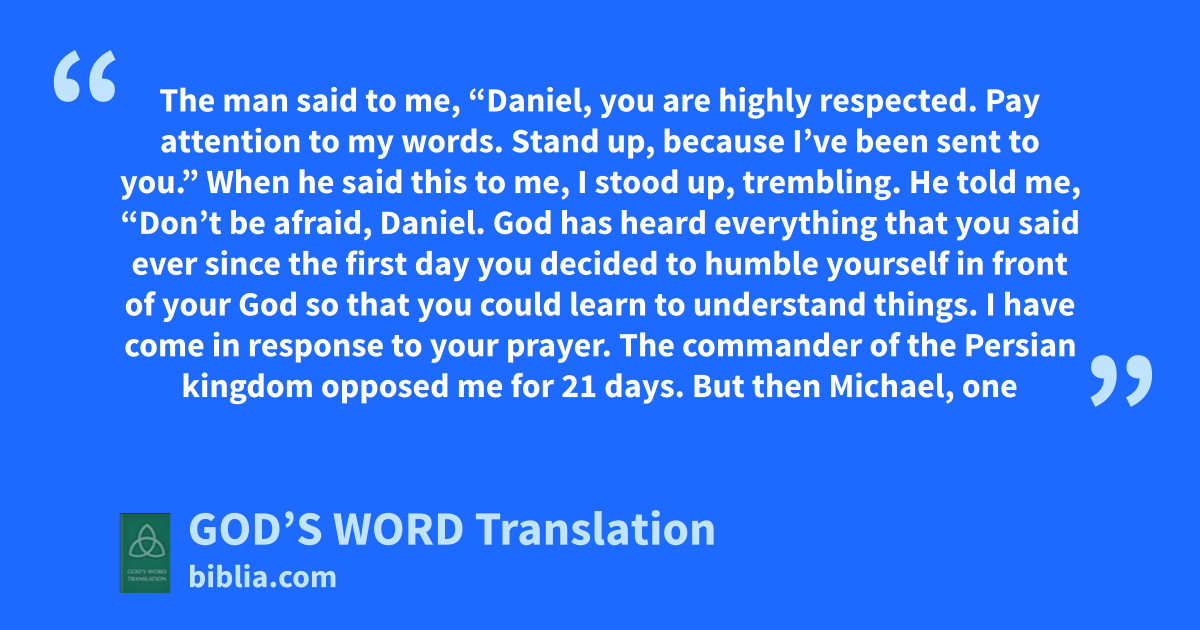 10 Then a hand touched me and made my hands and knees shake. 11 The man said to me, “Daniel, you are highly respected. Pay attention to my words. Stand up, because I’ve been sent to you.” When he said this to me, I stood up, trembling. 12 He told me, “Don’t be afraid, Daniel. God has heard everything that you said ever since the first day you decided to humble yourself in front of your God so that you could learn to understand things. I have come in response to your prayer. 13 The commander of the Persian kingdom opposed me for 21 days. But then Michael, one of the chief commanders, came to help me because I was left alone with the kings of Persia. 14 I have come to explain to you what will happen to your people in the last days, because the vision is about times still to come.”