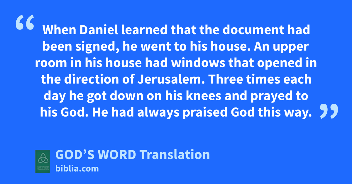 10 When Daniel learned that the document had been signed, he went to his house. An upper room in his house had windows that opened in the direction of Jerusalem. Three times each day he got down on his knees and prayed to his God. He had always praised God this way.