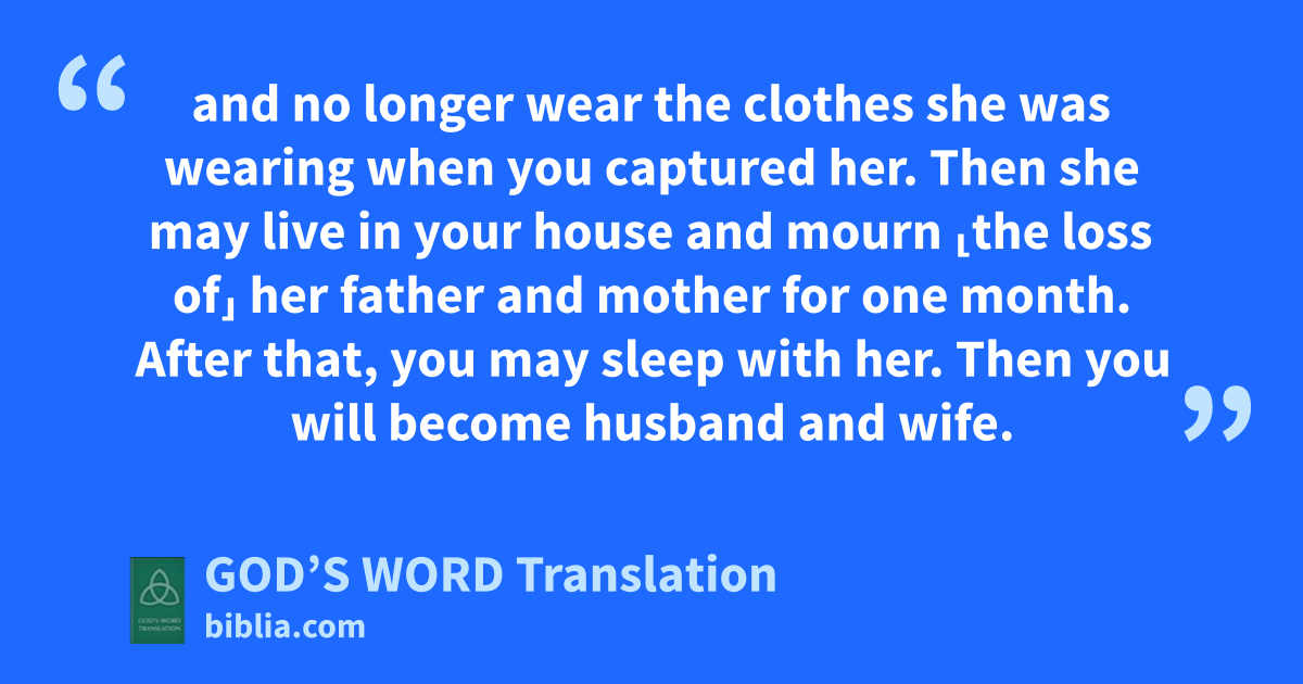 10 When you go to war with your enemies and the Lord your God hands them over to you, you may take them captive. 11 If you see a beautiful woman among the captives and have your heart set on her, you may marry her. 12 Bring her into your home. She must shave her head, cut her nails, 13 and no longer wear the clothes she was wearing when you captured her. Then she may live in your house and mourn ⸤the loss of⸥ her father and mother for one month. After that, you may sleep with her. Then you will become husband and wife.