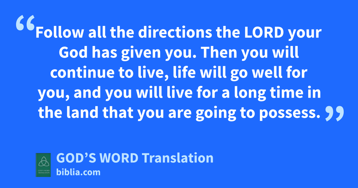 32 So be careful to do what the Lord your God has commanded you. Never stop living this way. 33 Follow all the directions the Lord your God has given you. Then you will continue to live, life will go well for you, and you will live for a long time in the land that you are going to possess.