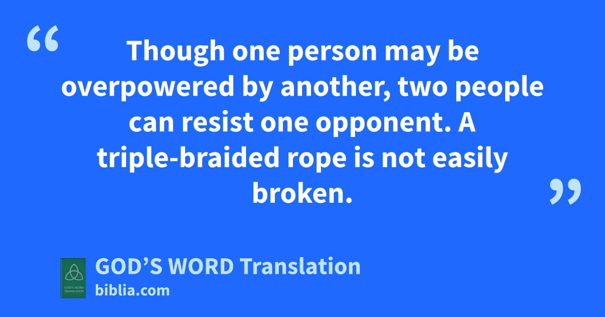 9 Two people are better than one because ⸤together⸥ they have a good reward for their hard work. 10 If one falls, the other can help his friend get up. But how tragic it is for the one who is ⸤all⸥ alone when he falls. There is no one to help him get up. 11 Again, if two people lie down together, they can keep warm, but how can one person keep warm? 12 Though one person may be overpowered by another, two people can resist one opponent. A triple-braided rope is not easily broken.