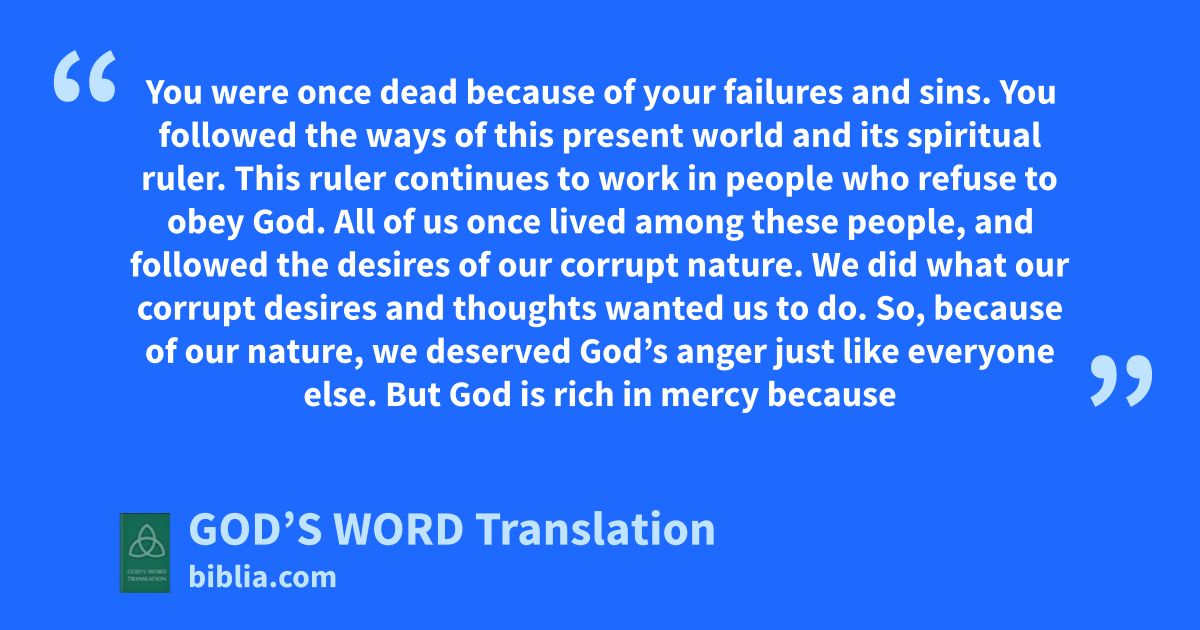 1 You were once dead because of your failures and sins. 2 You followed the ways of this present world and its spiritual ruler. This ruler continues to work in people who refuse to obey God. 3 All of us once lived among these people, and followed the desires of our corrupt nature. We did what our corrupt desires and thoughts wanted us to do. So, because of our nature, we deserved God’s anger just like everyone else.