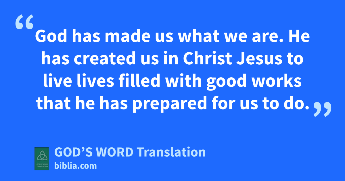 4 But God is rich in mercy because of his great love for us. 5 We were dead because of our failures, but he made us alive together with Christ. (It is God’s kindnessa that saved you.) 6 God has brought us back to life together with Christ Jesus and has given us a position in heaven with him. 7 He did this through Christ Jesus out of his generosity to us in order to show his extremely rich kindness in the world to come. 8 God saved you through faith as an act of kindness. You had nothing to do with it. Being saved is a gift from God. 9 It’s not the result of anything you’ve done, so no one can brag about it. 10 God has made us what we are. He has created us in Christ Jesus to live lives filled with good works that he has prepared for us to do.