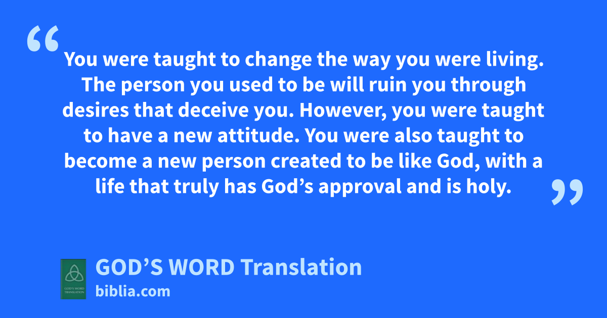 20 But that is not what you learned from Christ’s teachings. 21 You have certainly heard his message and have been taught his ways. The truth is in Jesus. 22 You were taught to change the way you were living. The person you used to be will ruin you through desires that deceive you. 23 However, you were taught to have a new attitude. 24 You were also taught to become a new person created to be like God, with a life that truly has God’s approval and is holy.