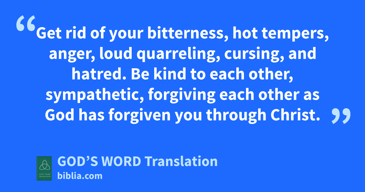 31 Get rid of your bitterness, hot tempers, anger, loud quarreling, cursing, and hatred. 32 Be kind to each other, sympathetic, forgiving each other as God has forgiven you through Christ.