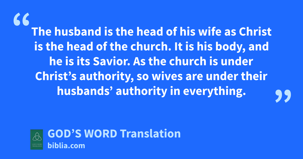 22 Wives, place yourselves under your husbands’ authority as you have placed yourselves under the Lord’s authority. 23 The husband is the head of his wife as Christ is the head of the church. It is his body, and he is its Savior. 24 As the church is under Christ’s authority, so wives are under their husbands’ authority in everything.