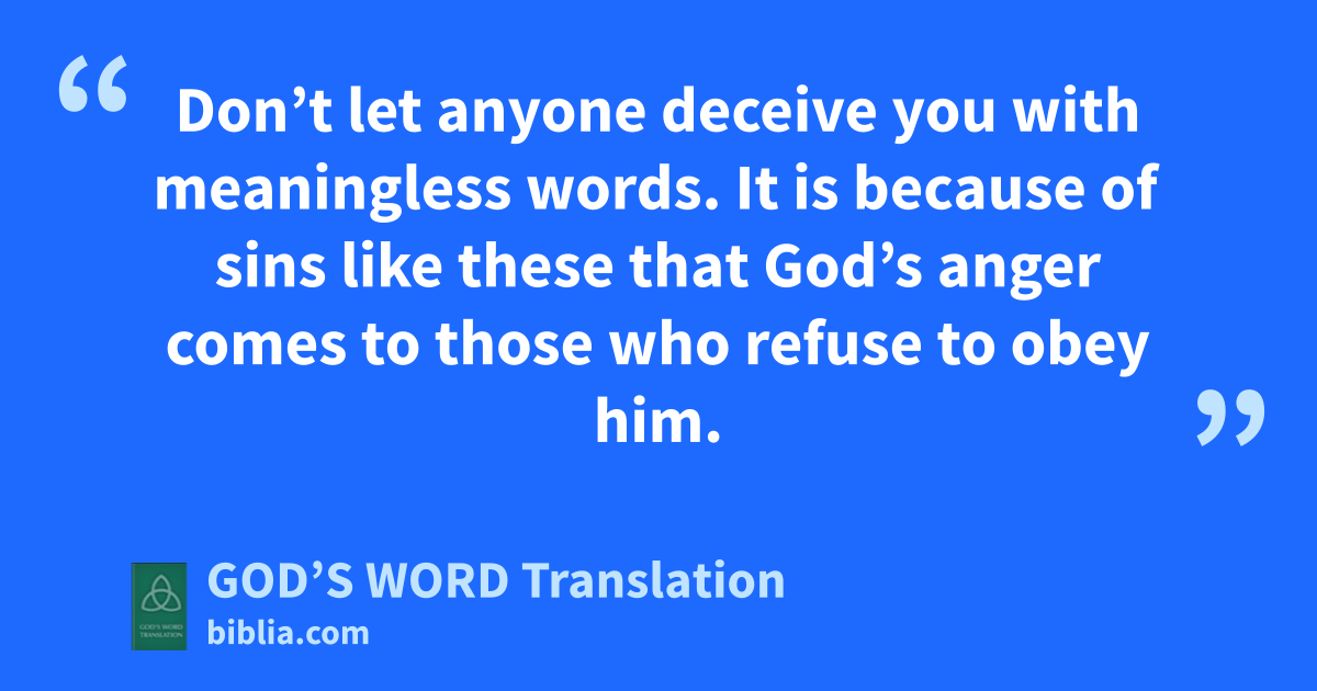 3 Don’t let sexual sin, perversion of any kind, or greed even be mentioned among you. This is not appropriate behavior for God’s holy people. 4 It’s not right that dirty stories, foolish talk, or obscene jokes should be mentioned among you either. Instead, give thanks ⸤to God⸥. 5 You know very well that no person who is involved in sexual sin, perversion, or greed (which means worshiping wealth) can have any inheritance in the kingdom of Christ and of God. 6 Don’t let anyone deceive you with meaningless words. It is because of sins like these that God’s anger comes to those who refuse to obey him. 7 Don’t be partners with them.