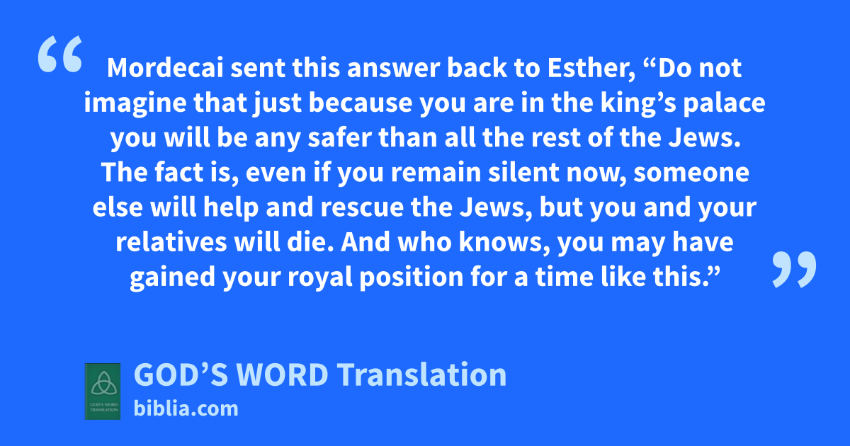13 Mordecai sent this answer back to Esther, “Do not imagine that just because you are in the king’s palace you will be any safer than all the rest of the Jews. 14 The fact is, even if you remain silent now, someone else will help and rescue the Jews, but you and your relatives will die. And who knows, you may have gained your royal position for a time like this.”