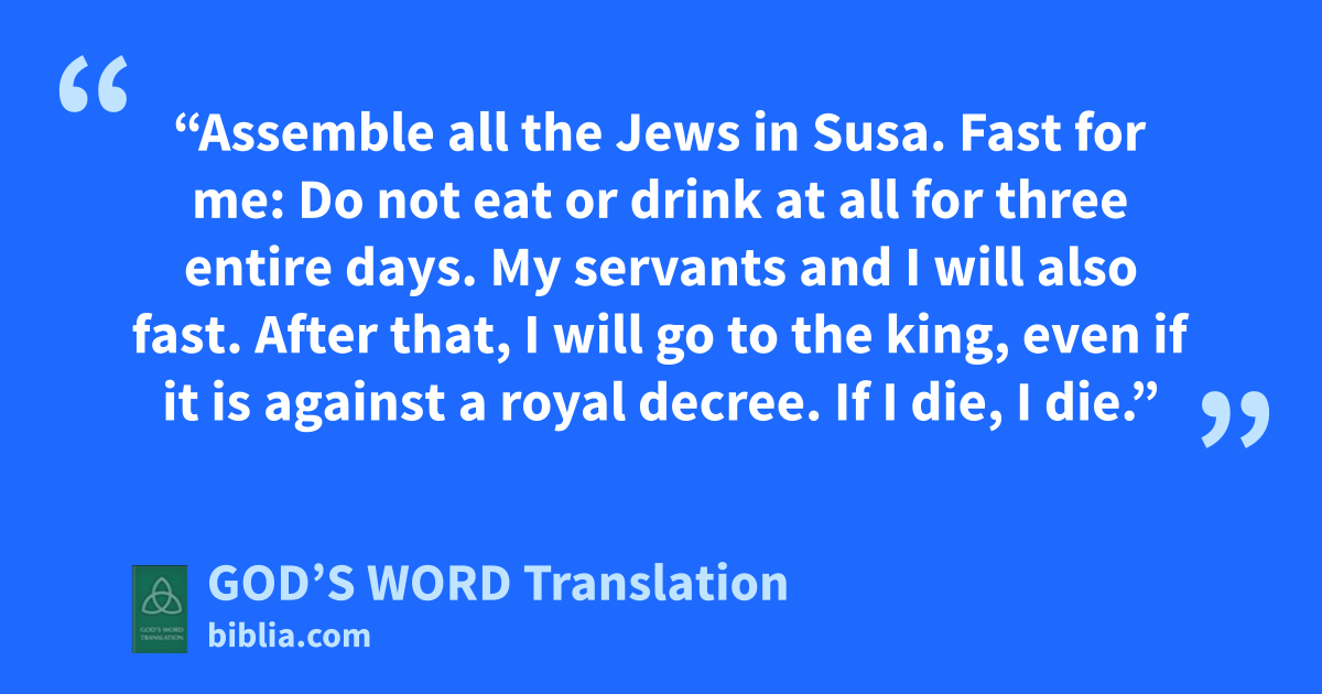 15 Esther sent this reply back to Mordecai, 16 “Assemble all the Jews in Susa. Fast for me: Do not eat or drink at all for three entire days. My servants and I will also fast. After that, I will go to the king, even if it is against a royal decree. If I die, I die.”
