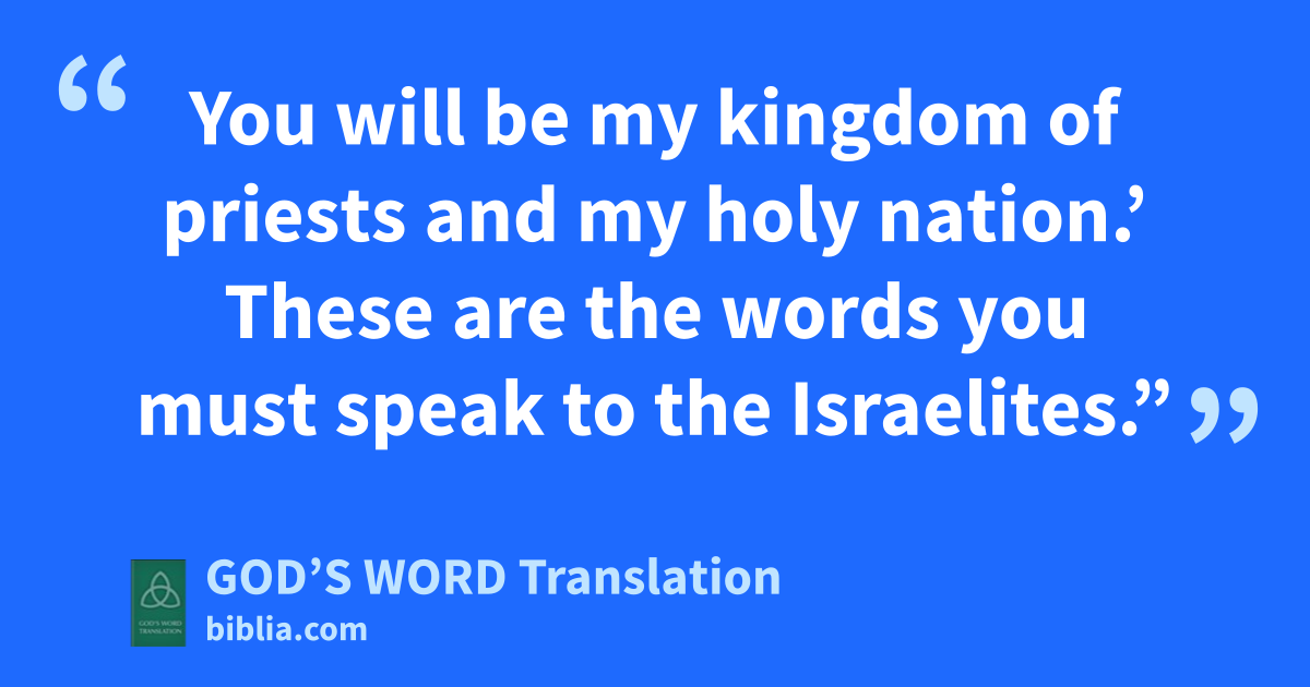 3 Then Moses went up the mountain to God, and the Lord called to him from the mountain, “This is what you must say to the descendants of Jacob. Tell the Israelites, 4 ‘You have seen for yourselves what I did to Egypt and how I carried you on eagles’ wings and brought you to my mountain. 5 If you carefully obey me and are faithful to the terms of my promise,a then out of all the nations you will be my own special possession, even though the whole world is mine. 6 You will be my kingdom of priests and my holy nation.’ These are the words you must speak to the Israelites.”