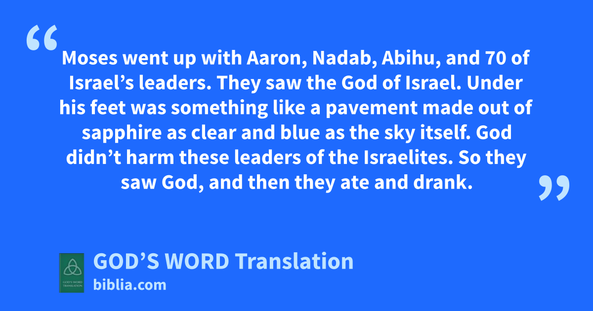 9 Moses went up with Aaron, Nadab, Abihu, and 70 of Israel’s leaders. 10 They saw the God of Israel. Under his feet was something like a pavement made out of sapphire as clear and blue as the sky itself. 11 God didn’t harm these leaders of the Israelites. So they saw God, and then they ate and drank.