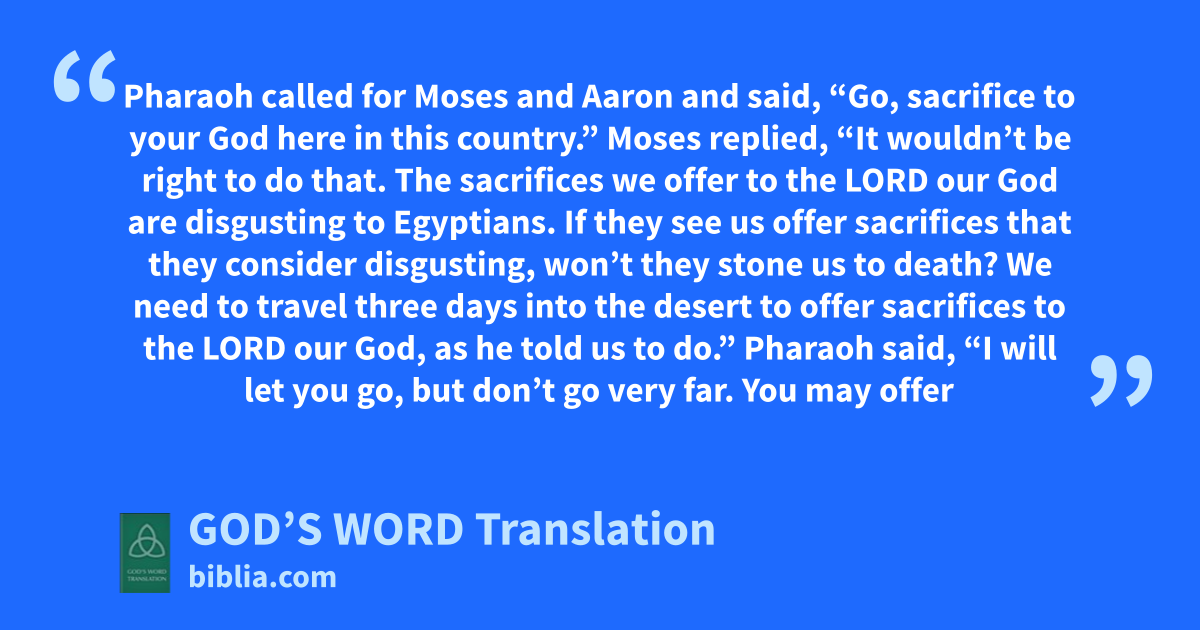 26 Moses replied, “It wouldn’t be right to do that. The sacrifices we offer to the Lord our God are disgusting to Egyptians. If they see us offer sacrifices that they consider disgusting, won’t they stone us to death? 27 We need to travel three days into the desert to offer sacrifices to the Lord our God, as he told us to do.”