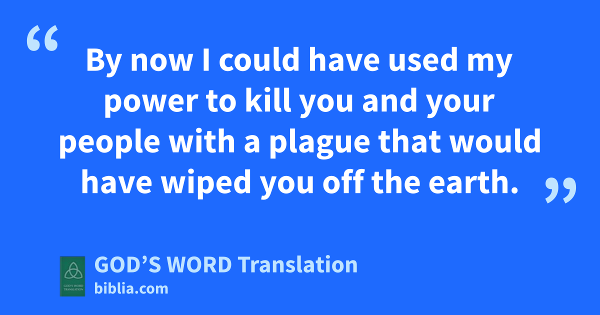 13 Then the Lord said to Moses, “Early in the morning, go to Pharaoh and say to him, ‘This is what the Lord God of the Hebrews says: Let my people go to worship me. 14 Now I will send plagues that will affect you personally as well as your officials and people. This is how you will know that there is no one like me anywhere on earth. 15 By now I could have used my power to kill you and your people with a plague that would have wiped you off the earth. 16 But I have spared you for this reason. I want to show you my power and make my name famous throughout the earth. 17 You are still blocking my people from leaving. 18 So, at this time tomorrow I will send the worst hailstorm that has ever happened in Egypt since the beginning of its history. 19 Now, send ⸤servants⸥ to bring your livestock and everything else you have indoors. All people and animals still outside and not brought in will die when the hail falls on them.’ ”