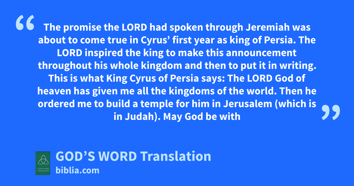 2 This is what King Cyrus of Persia says: The Lord God of heaven has given me all the kingdoms of the world. Then he ordered me to build a temple for him in Jerusalem (which is in Judah). 3 May God be with all of you who are his people. You may go to Jerusalem (which is in Judah) and build a temple for the Lord God of Israel. He is the God who is in Jerusalem. 4 All who ⸤choose to⸥ remain behind, wherever they may be living, should provide the people who are leaving with silver, gold, supplies, livestock, and freewill offerings to be used in God’s temple in Jerusalem.