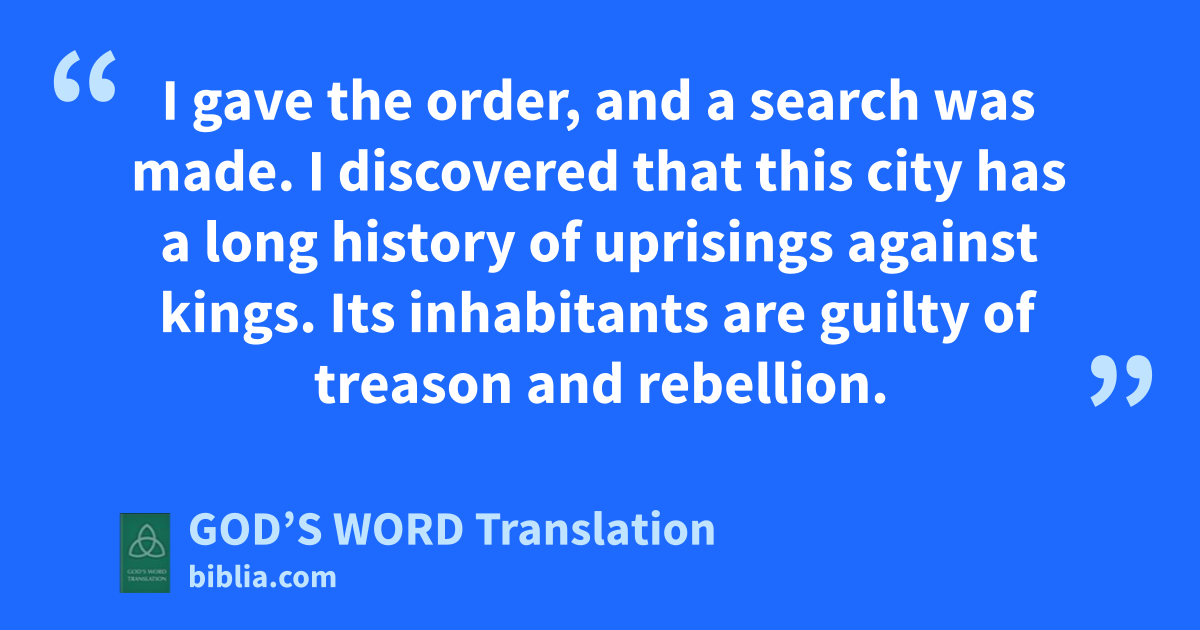 18 The letter you sent me has been read word for word in my presence. 19 I gave the order, and a search was made. I discovered that this city has a long history of uprisings against kings. Its inhabitants are guilty of treason and rebellion. 20 Jerusalem has had powerful kings who have ruled the whole ⸤province⸥ west of the Euphrates. Taxes, fees, and tolls were paid to them. 21 So order these men to stop rebuilding. Keep this city from being rebuilt until I give the order. 22 Be careful not to neglect your duty in this matter. Why should I, the king, suffer any more harm?