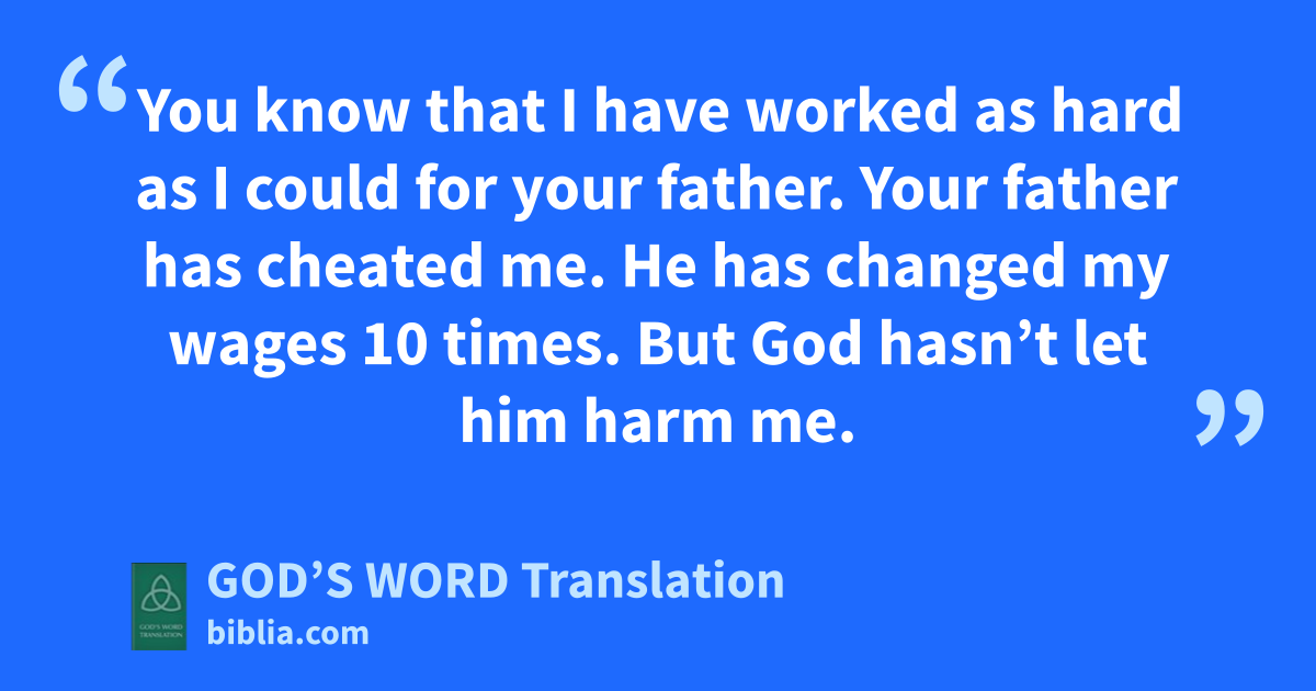 4 So Jacob sent a message to Rachel and Leah to come out to the open country where his flocks were. 5 He said to them, “I have seen that your father isn’t as friendly to me as he was before, but the God of my father has been with me. 6 You know that I have worked as hard as I could for your father. 7 Your father has cheated me. He has changed my wages 10 times. But God hasn’t let him harm me. 8 Whenever he said, ‘The speckled ones will be your wages,’ all the flocks gave birth to speckled young. And whenever he said, ‘The striped ones will be your wages,’ all the flocks gave birth to striped young. 9 So God has taken away your father’s livestock and has given them to me.