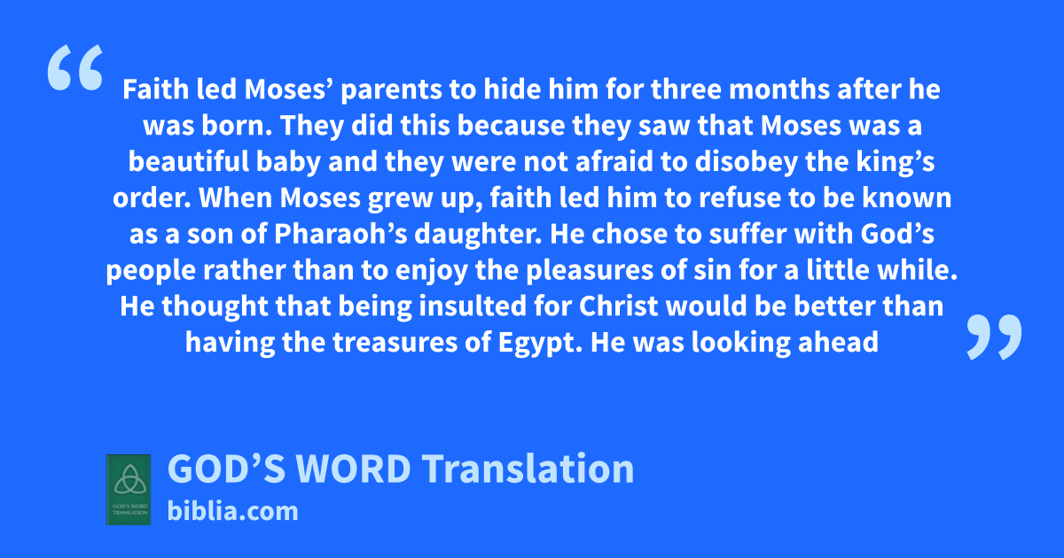 24 When Moses grew up, faith led him to refuse to be known as a son of Pharaoh’s daughter. 25 He chose to suffer with God’s people rather than to enjoy the pleasures of sin for a little while. 26 He thought that being insulted for Christ would be better than having the treasures of Egypt. He was looking ahead to his reward.