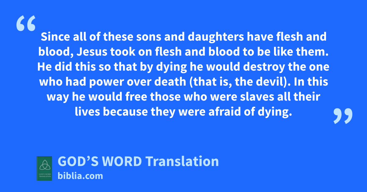 14 Since all of these sons and daughters have flesh and blood, Jesus took on flesh and blood to be like them. He did this so that by dying he would destroy the one who had power over death (that is, the devil). 15 In this way he would free those who were slaves all their lives because they were afraid of dying. 16 So Jesus helps Abraham’s descendants rather than helping angels. 17 Therefore, he had to become like his brothers and sisters so that he could be merciful. He became like them so that he could serve as a faithful chief priest in God’s presence and make peace with God for their sins. 18 Because Jesus experienced temptation when he suffered, he is able to help others when they are tempted.