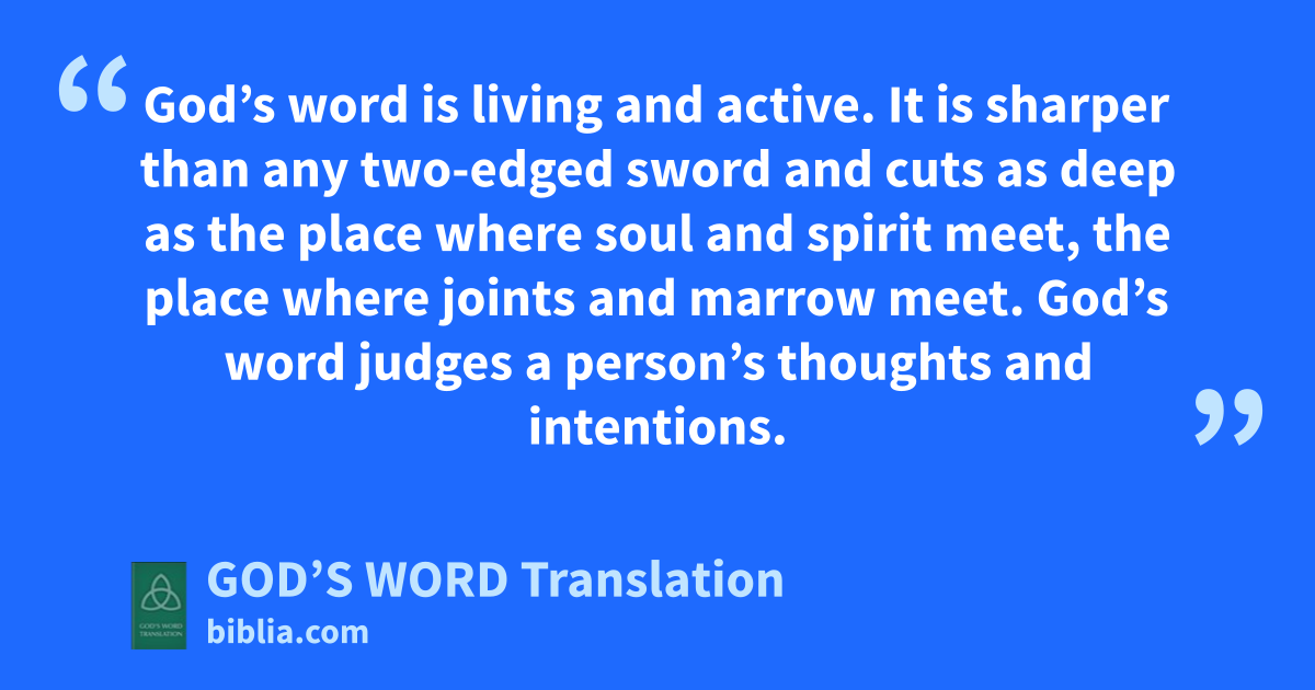 12 God’s word is living and active. It is sharper than any two-edged sword and cuts as deep as the place where soul and spirit meet, the place where joints and marrow meet. God’s word judges a person’s thoughts and intentions. 13 No creature can hide from God. Everything is uncovered and exposed for him to see. We must answer to him.