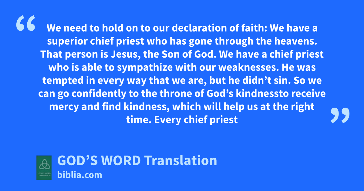 14 We need to hold on to our declaration of faith: We have a superior chief priest who has gone through the heavens. That person is Jesus, the Son of God. 15 We have a chief priest who is able to sympathize with our weaknesses. He was tempted in every way that we are, but he didn’t sin. 16 So we can go confidently to the throne of God’s kindnessa to receive mercy and find kindness, which will help us at the right time.