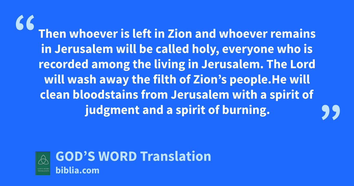 3 Then whoever is left in Zion and whoever remains in Jerusalem will be called holy, everyone who is recorded among the living in Jerusalem. 4 The Lord will wash away the filth of Zion’s people.a He will clean bloodstains from Jerusalem with a spirit of judgment and a spirit of burning. 5 The Lord will create a cloud of smoke during the day and a glowing flame of fire during the night over the whole area of Mount Zion and over the assembly. His glory will cover everything. 6 It will be a shelter from the heat during the day as well as a refuge and hiding place from storms and rain.