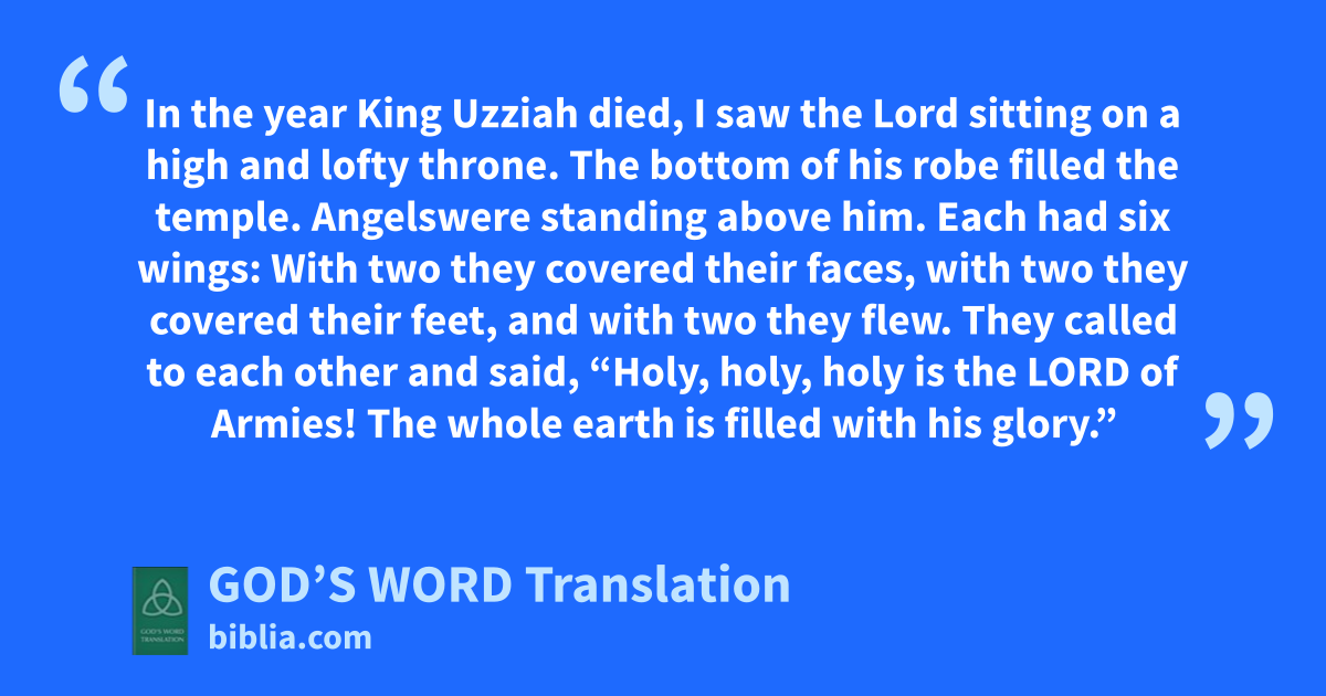 1 In the year King Uzziah died, I saw the Lord sitting on a high and lofty throne. The bottom of his robe filled the temple. 2 Angelsa were standing above him. Each had six wings: With two they covered their faces, with two they covered their feet, and with two they flew. 3 They called to each other and said,
