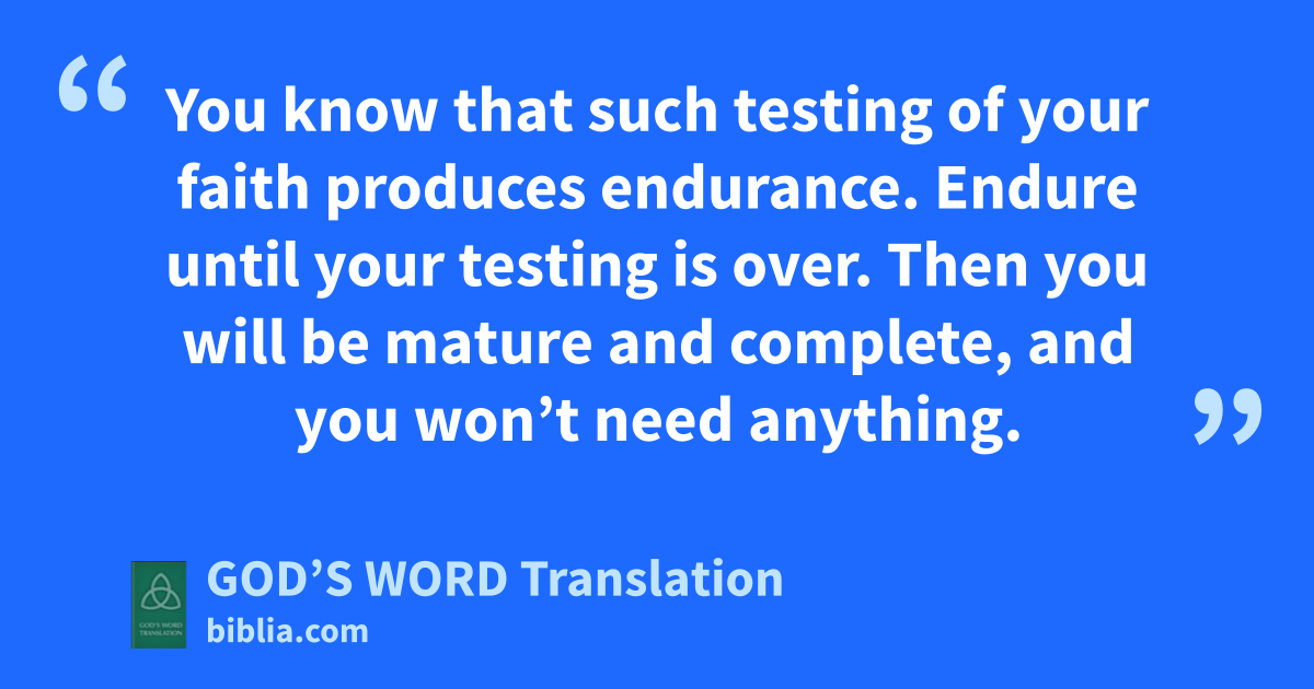 2 My brothers and sisters, be very happy when you are tested in different ways. 3 You know that such testing of your faith produces endurance. 4 Endure until your testing is over. Then you will be mature and complete, and you won’t need anything.
