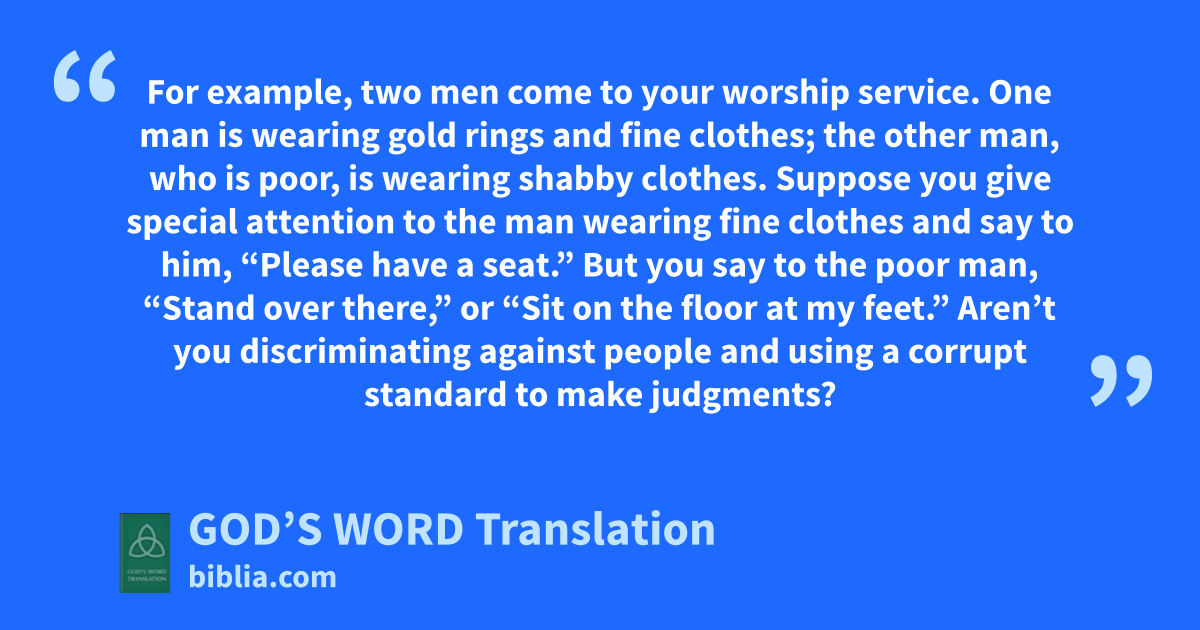 1 My brothers and sisters, practice your faith in our glorious Lord Jesus Christ by not favoring one person over another. 2 For example, two men come to your worship service. One man is wearing gold rings and fine clothes; the other man, who is poor, is wearing shabby clothes. 3 Suppose you give special attention to the man wearing fine clothes and say to him, “Please have a seat.” But you say to the poor man, “Stand over there,” or “Sit on the floor at my feet.” 4 Aren’t you discriminating against people and using a corrupt standard to make judgments?