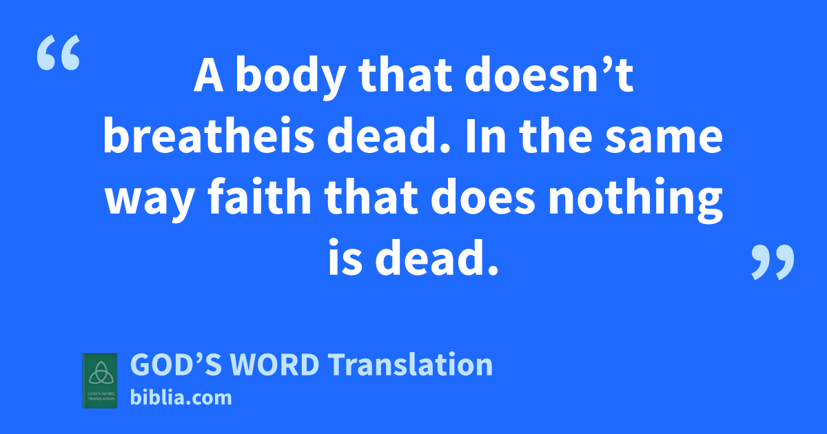 14 My brothers and sisters, what good does it do if someone claims to have faith but doesn’t do any good things? Can this kind of faith save him? 15 Suppose a believer, whether a man or a woman, needs clothes or food 16 and one of you tells that person, “God be with you! Stay warm, and make sure you eat enough.” If you don’t provide for that person’s physical needs, what good does it do? 17 In the same way, faith by itself is dead if it doesn’t cause you to do any good things.