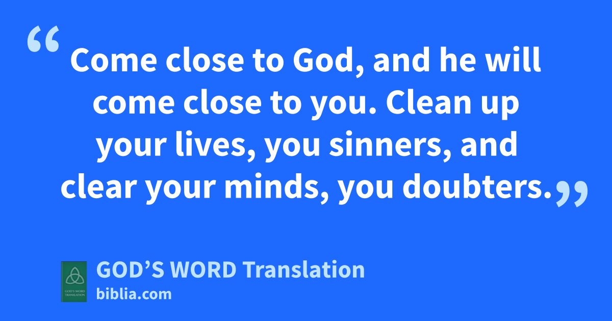 7 So place yourselves under God’s authority. Resist the devil, and he will run away from you. 8 Come close to God, and he will come close to you. Clean up your lives, you sinners, and clear your minds, you doubters. 9 Be miserable, mourn, and cry. Turn your laughter into mourning and your joy into gloom. 10 Humble yourselves in the Lord’s presence. Then he will give you a high position.