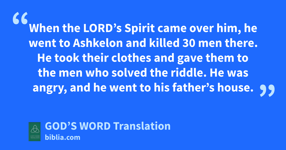 19 When the Lord’s Spirit came over him, he went to Ashkelon and killed 30 men there. He took their clothes and gave them to the men who solved the riddle. He was angry, and he went to his father’s house. 20 Samson’s wife was given to his best man.