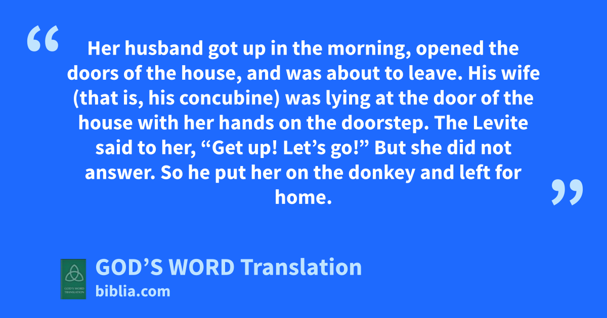 27 Her husband got up in the morning, opened the doors of the house, and was about to leave. His wife (that is, his concubine) was lying at the door of the house with her hands on the doorstep. 28 The Levite said to her, “Get up! Let’s go!” But she did not answer. So he put her on the donkey and left for home.