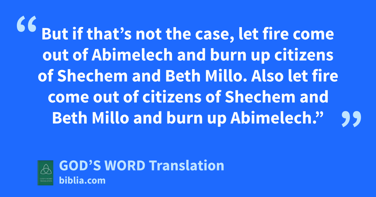 16 “If you acted with sincerity and integrity when you made Abimelech king, ⸤be happy.⸥ If you treated Jerubbaal and his family well, if you treated him as he deserved, be happy. 17 My father fought for you. He risked his life and rescued you from Midian. 18 But today you have attacked my father’s family. You have executed his 70 sons. You have made Abimelech, who is the son of my father’s slave girl, king over the citizens of Shechem just because he’s your brother. 19 So if you are now acting with sincerity and integrity toward Jerubbaal and his family, then be happy with Abimelech and let Abimelech be happy with you. 20 But if that’s not the case, let fire come out of Abimelech and burn up citizens of Shechem and Beth Millo. Also let fire come out of citizens of Shechem and Beth Millo and burn up Abimelech.”