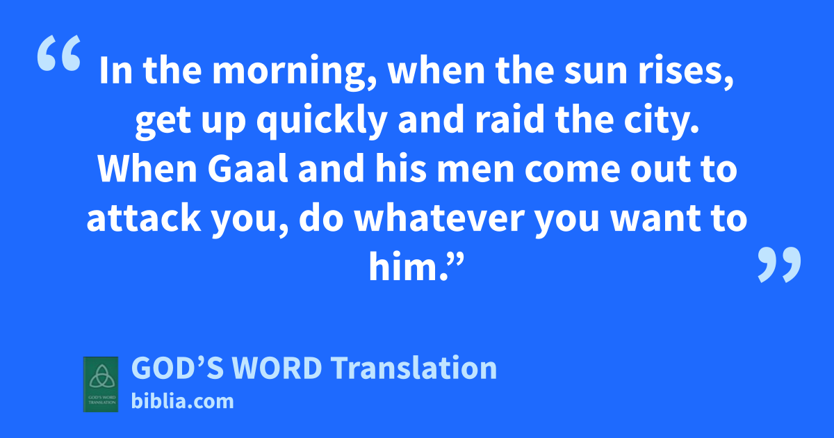 30 Zebul, Shechem’s ruler, heard what Gaal (son of Ebed) had said, and he became angry. 31 He secretly sent messengers to Abimelech. “Watch out! Gaal (son of Ebed) and his brothers have come to Shechem. They have turned the city against you. 32 You and your men must start out tonight. Set an ambush ⸤for them⸥ in the fields ⸤around Shechem⸥. 33 In the morning, when the sun rises, get up quickly and raid the city. When Gaal and his men come out to attack you, do whatever you want to him.”