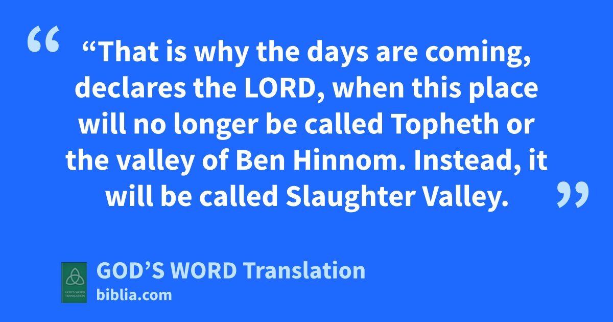6 “That is why the days are coming, declares the Lord, when this place will no longer be called Topheth or the valley of Ben Hinnom. Instead, it will be called Slaughter Valley. 7 I will smash the plans of Judah and Jerusalem in this place. I will cut them down with swords in front of their enemies and with the hands of those who want to kill them. I will give their bodies as food to birds and to animals. 8 I will devastate this city. It will become something to hiss at. Everyone who goes by it will be stunned and hiss with contempt at all the disasters that happen to it. 9 I will make the people eat the flesh of their sons and daughters. They will eat each other’s flesh during blockades and hardships that their enemies impose on them when they want to kill them.”