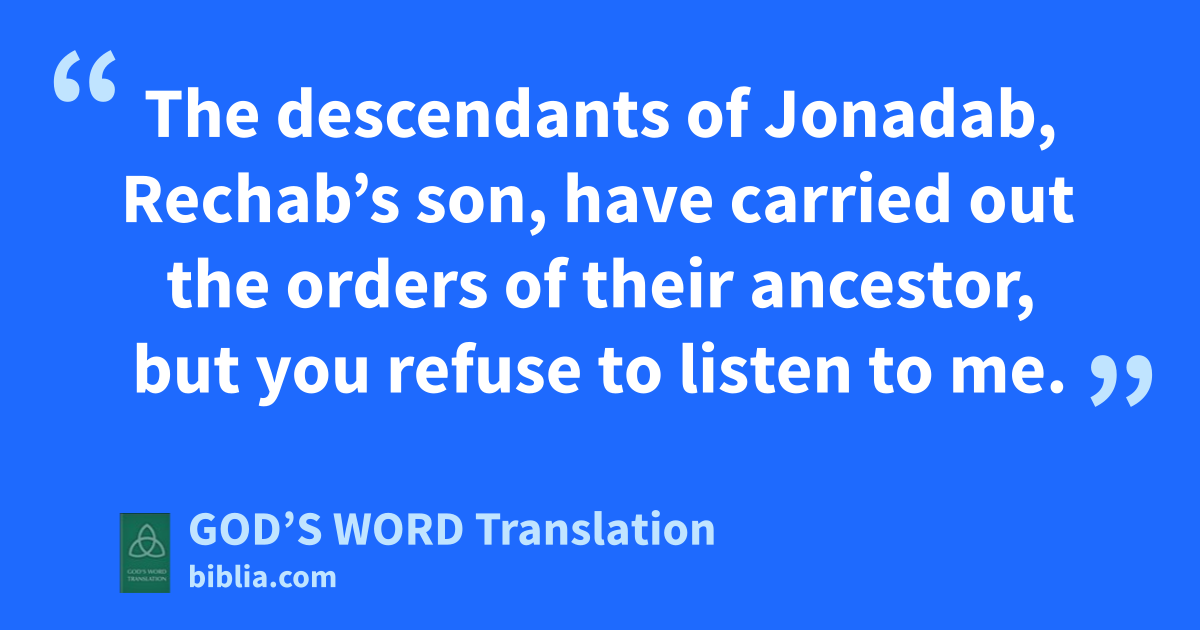 12 Then the Lord spoke his word to Jeremiah. He said, 13 “This is what the Lord of Armies, the God of Israel, says: Tell the people of Judah and those who live in Jerusalem, ‘Won’t you ever learn your lesson and obey my words? declares the Lord. 14 Jonadab, Rechab’s son, ordered his descendants not to drink wine. This order has been carried out. His descendants have not drunk any wine to this day, because they have obeyed their ancestor’s order. I have spoken to you again and again, but you have refused to listen to me. 15 I have sent all my servants the prophets to you again and again. They said, “Turn from your evil ways, do what is right, and don’t follow other gods in order to serve them. Then you will live in the land that I gave you and your ancestors.” However, you refused to listen to me or obey me. 16 The descendants of Jonadab, Rechab’s son, have carried out the orders of their ancestor, but you refuse to listen to me.