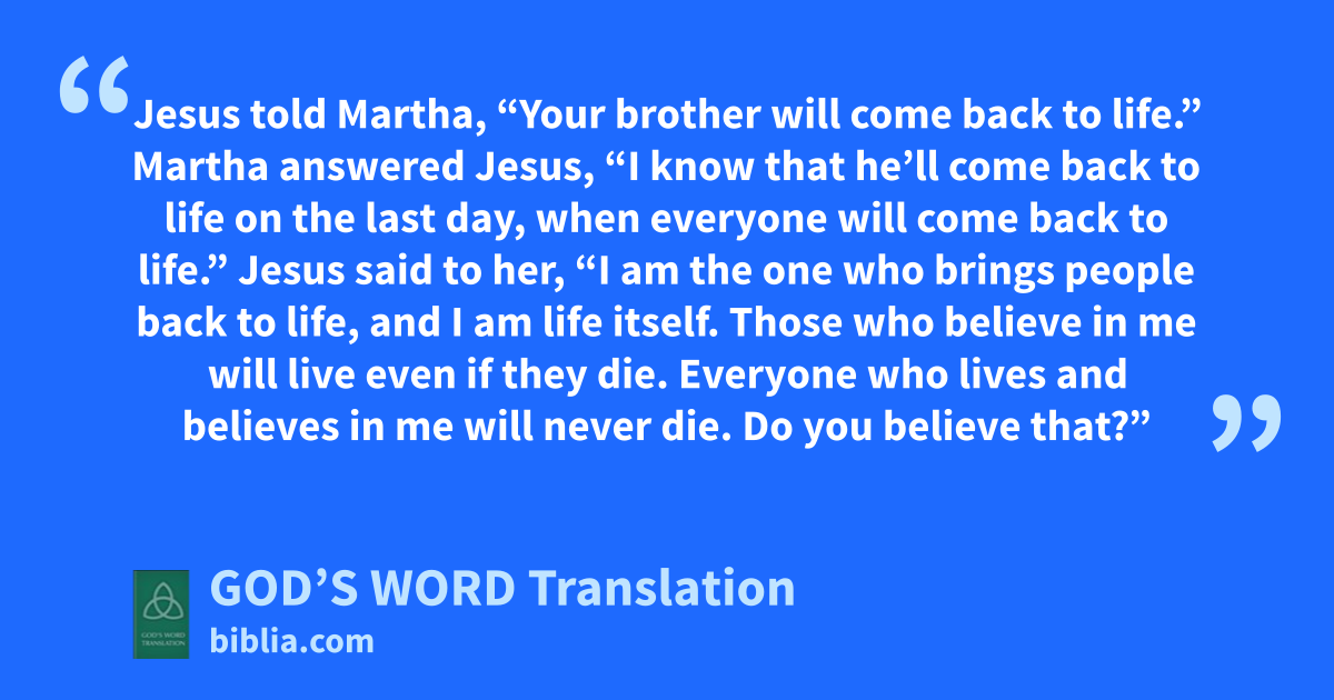 24 Martha answered Jesus, “I know that he’ll come back to life on the last day, when everyone will come back to life.”