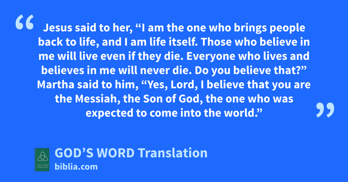 25 Jesus said to her, “I am the one who brings people back to life, and I am life itself. Those who believe in me will live even if they die. 26 Everyone who lives and believes in me will never die. Do you believe that?”