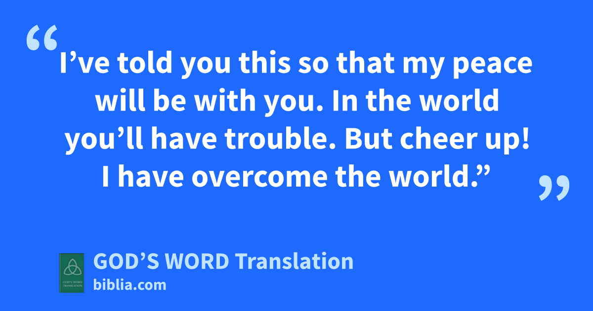 31 Jesus replied to them, “Now you believe. 32 The time is coming, and is already here, when all of you will be scattered. Each of you will go your own way and leave me all alone. Yet, I’m not all alone, because the Father is with me. 33 I’ve told you this so that my peace will be with you. In the world you’ll have trouble. But cheer up! I have overcome the world.”