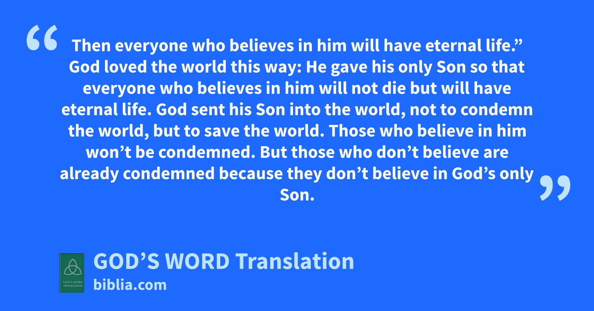 16 God loved the world this way: He gave his only Son so that everyone who believes in him will not die but will have eternal life. 17 God sent his Son into the world, not to condemn the world, but to save the world. 18 Those who believe in him won’t be condemned. But those who don’t believe are already condemned because they don’t believe in God’s only Son.