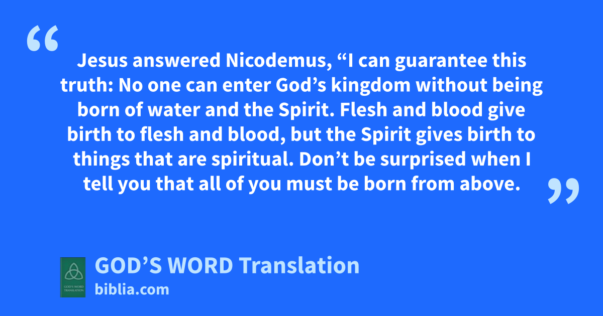 5 Jesus answered Nicodemus, “I can guarantee this truth: No one can enter God’s kingdom without being born of water and the Spirit. 6 Flesh and blood give birth to flesh and blood, but the Spirit gives birth to things that are spiritual. 7 Don’t be surprised when I tell you that all of you must be born from above. 8 The windb blows wherever it pleases. You hear its sound, but you don’t know where the wind comes from or where it’s going. That’s the way it is with everyone born of the Spirit.”
