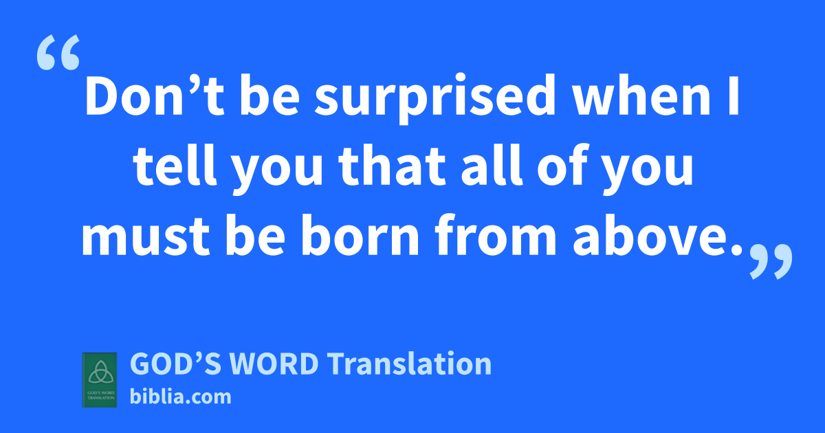 5 Jesus answered Nicodemus, “I can guarantee this truth: No one can enter God’s kingdom without being born of water and the Spirit. 6 Flesh and blood give birth to flesh and blood, but the Spirit gives birth to things that are spiritual. 7 Don’t be surprised when I tell you that all of you must be born from above. 8 The windb blows wherever it pleases. You hear its sound, but you don’t know where the wind comes from or where it’s going. That’s the way it is with everyone born of the Spirit.”