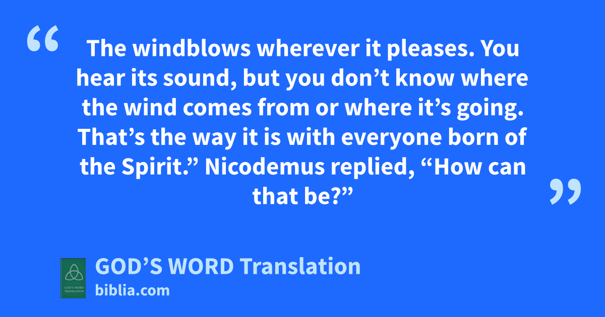 5 Jesus answered Nicodemus, “I can guarantee this truth: No one can enter God’s kingdom without being born of water and the Spirit. 6 Flesh and blood give birth to flesh and blood, but the Spirit gives birth to things that are spiritual. 7 Don’t be surprised when I tell you that all of you must be born from above. 8 The windb blows wherever it pleases. You hear its sound, but you don’t know where the wind comes from or where it’s going. That’s the way it is with everyone born of the Spirit.”