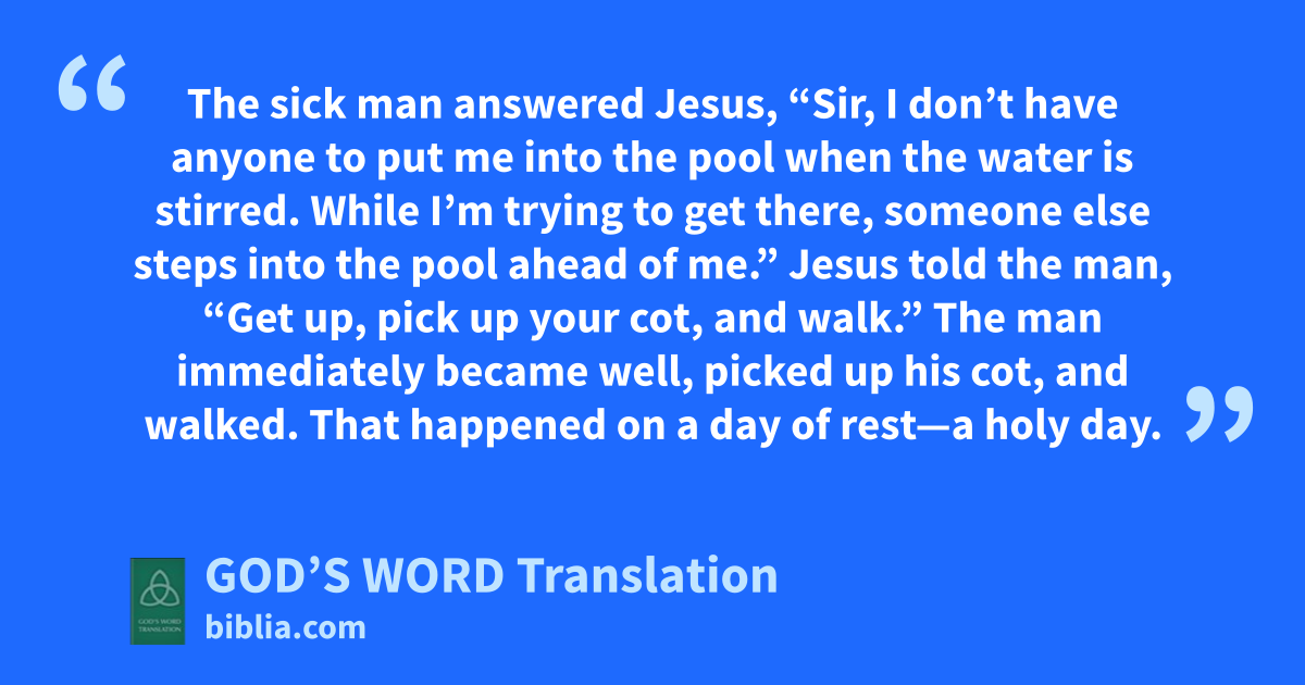 2 Near Sheep Gate in Jerusalem was a pool called Bethesda in Hebrew. It had five porches. 3 Under these porches a large number of sick people—people who were blind, lame, or paralyzed—used to lie.a 5 One man, who had been sick for 38 years, was lying there. 6 Jesus saw the man lying there and knew that he had been sick for a long time. So Jesus asked the man, “Would you like to get well?”